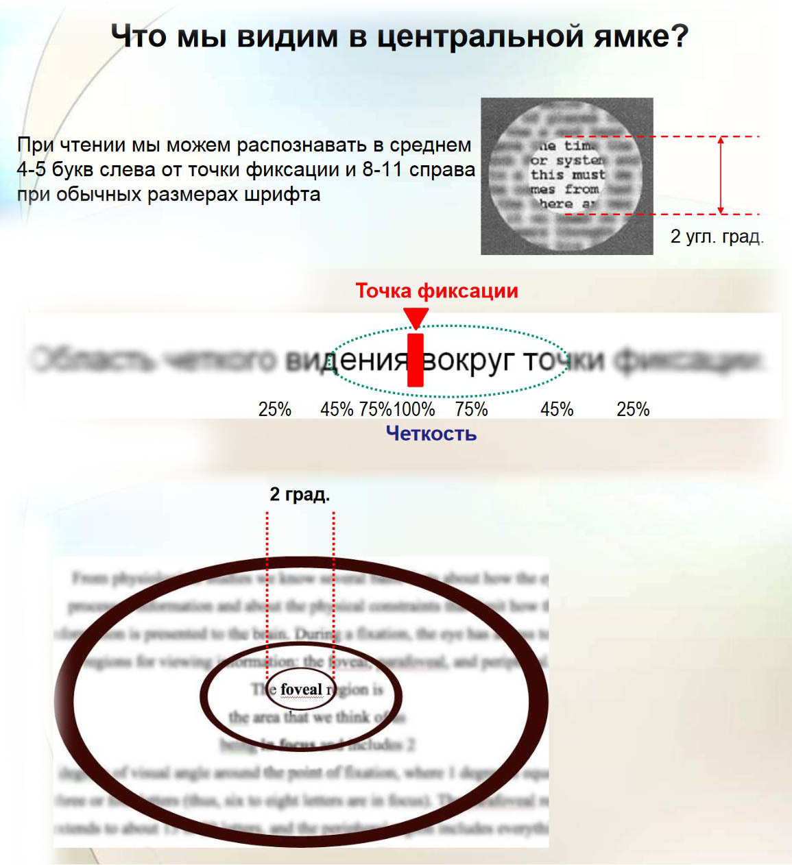- Использование периферийного зрения: глаза охватывают сразу больше слов, не фиксируясь на каждом из них по отдельности.